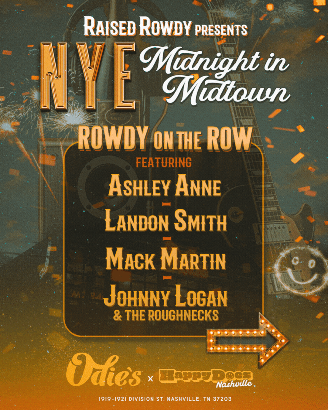 This New Year’s Eve, Raised Rowdy presents “Midnight in Midtown,” the ultimate Nashville neighborhood bash at Odie’s & Happy Does. Join us for a double-venue takeover— all day & night!